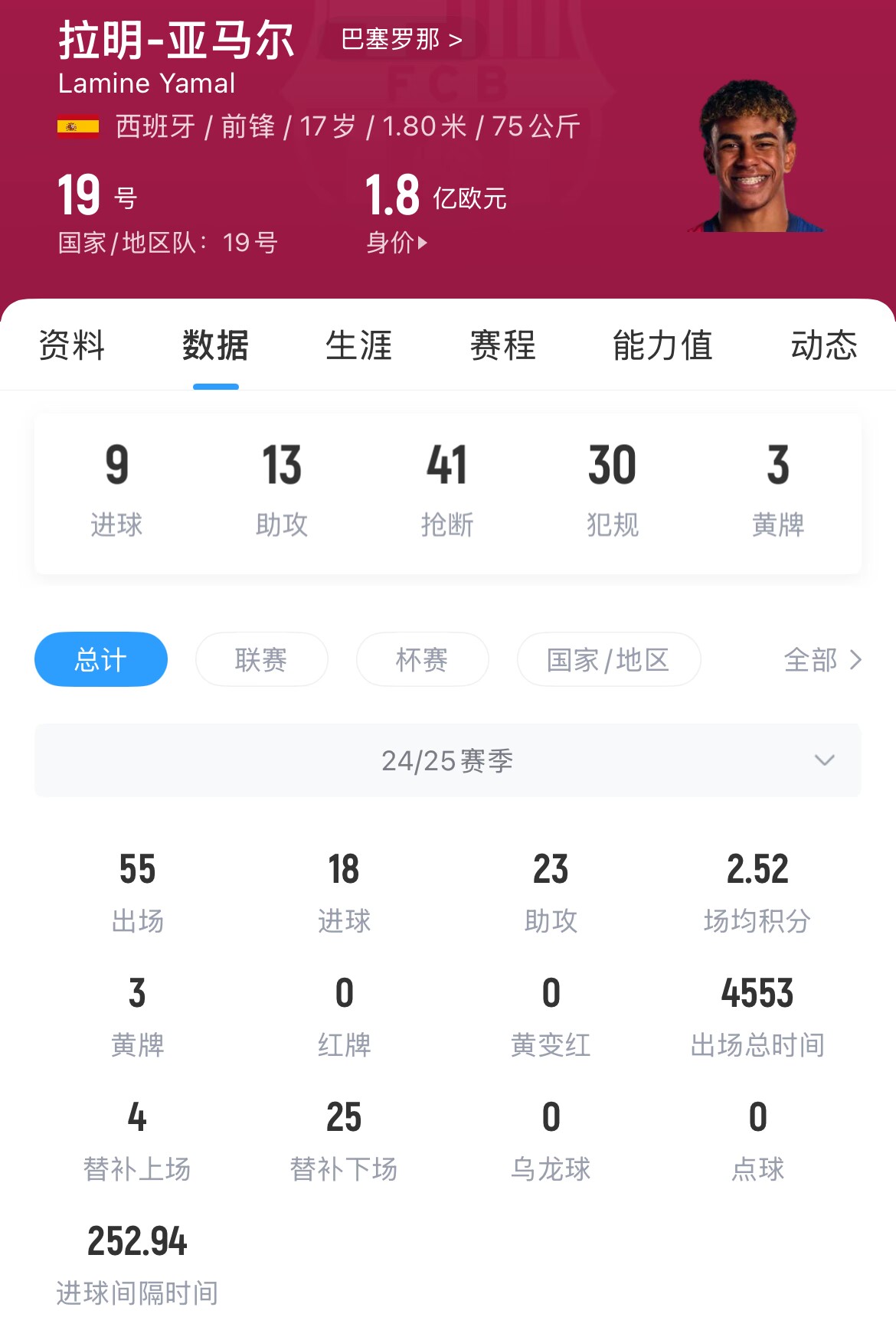 j9九游真人游戏第一平台本赛季17岁的亚马尔表现出色,为巴萨出场55次,打进18球、助攻23次,帮助球队拿下西甲冠军、西班牙国王杯冠军以及西班牙超级杯冠军。目前其德转身价已达1.8亿欧元。